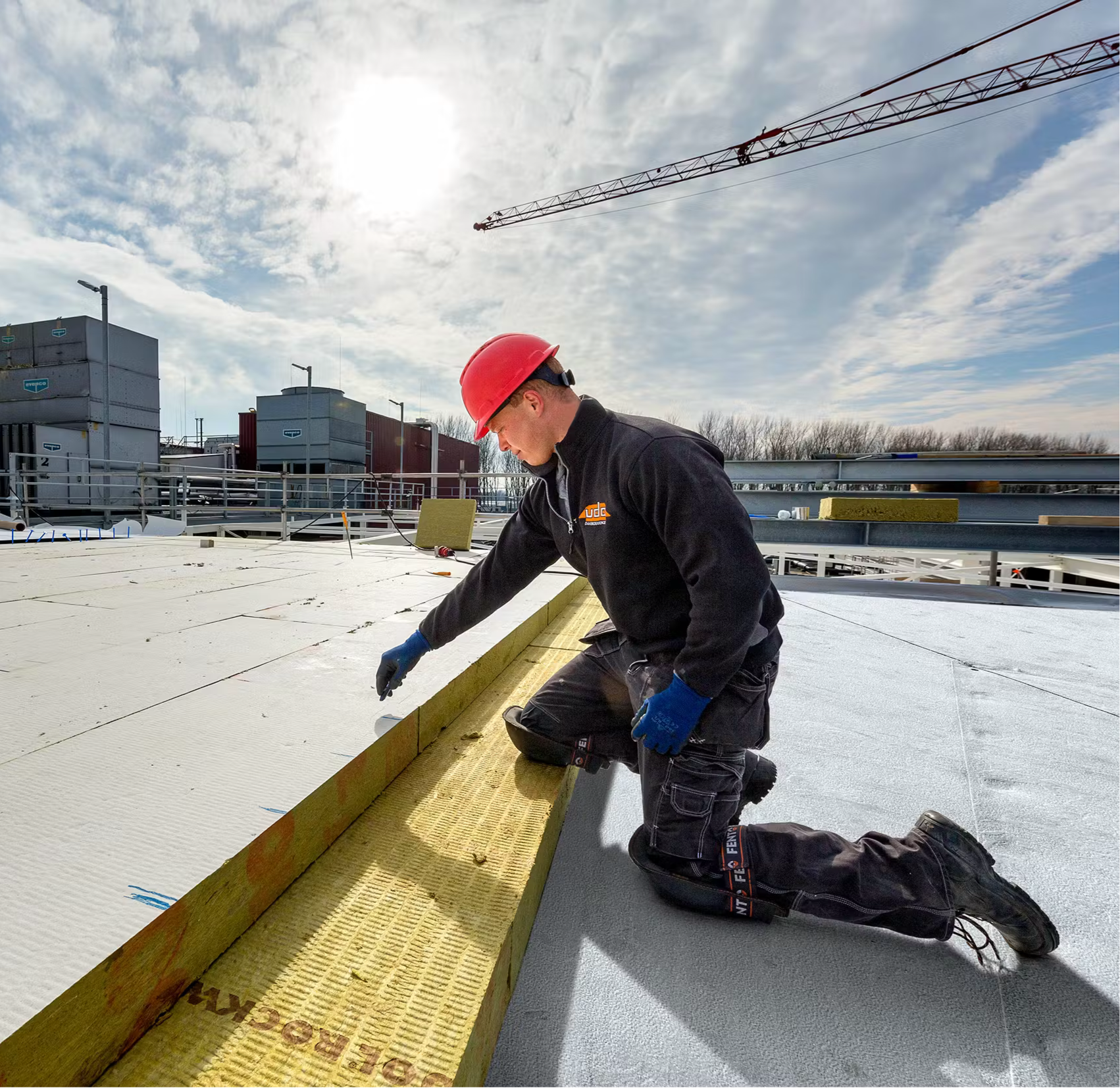 De dakafdichting kan rechtstreeks op de isolatieplaat worden gebrand, verkleefd of gelijmd.